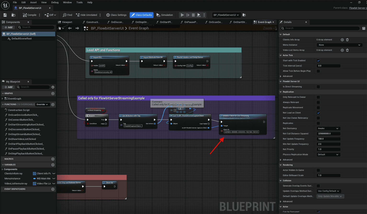 Once the blueprint editor has opened, locate the blueprint function named Initialize Client for Live Streaming. This function is responsible for setting up the client for live streaming. You can find it in the Functions list on the left side of the blueprint editor