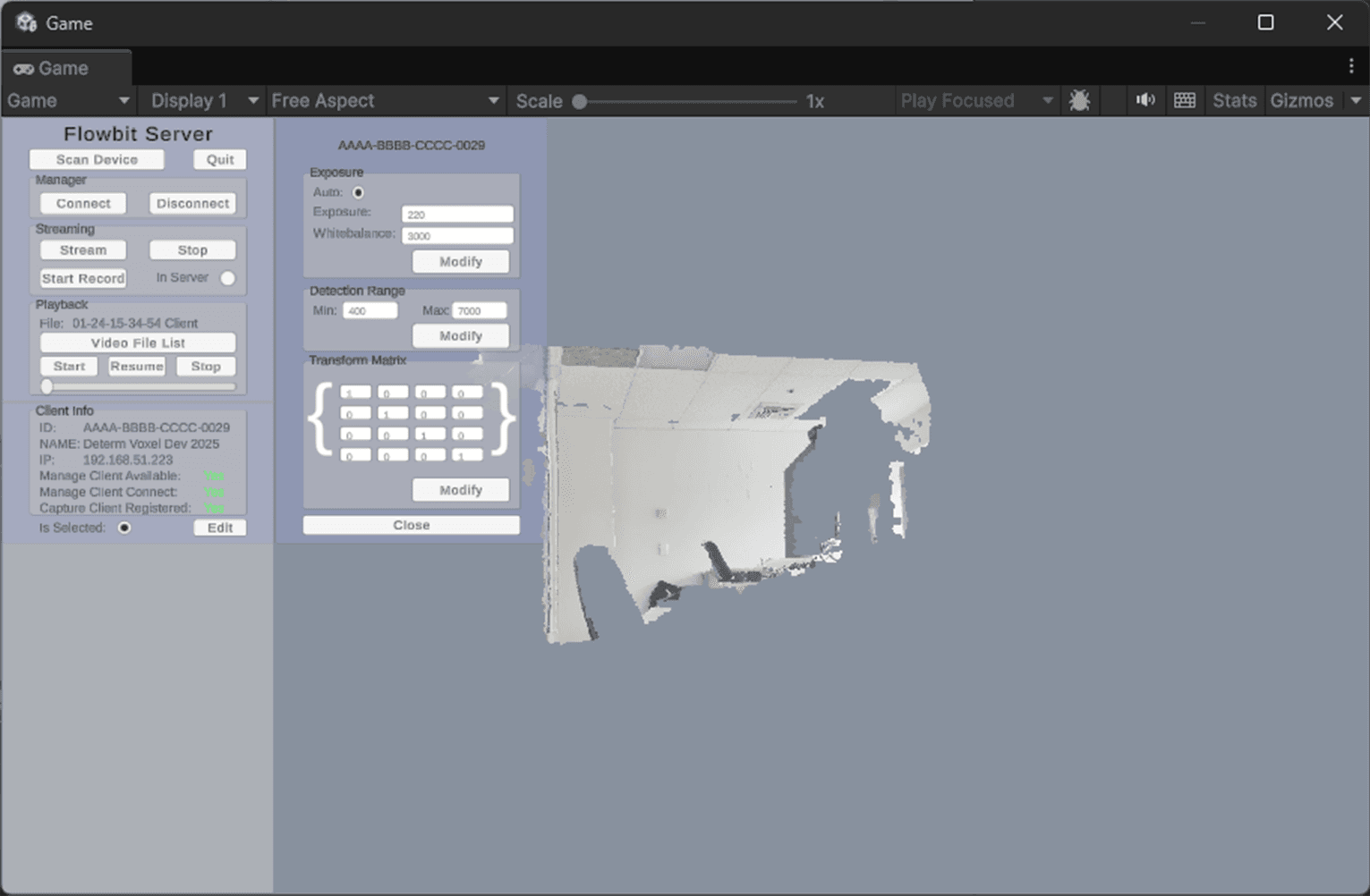 If you press the Edit button on the Client info panel, you can modify the exposure, detection range, and transform matrix (used for aligning the point clouds from different devices in the space).