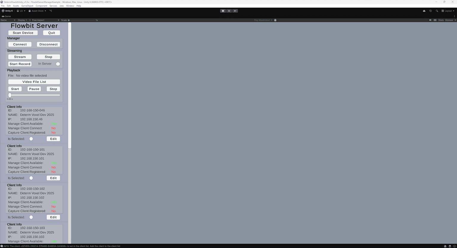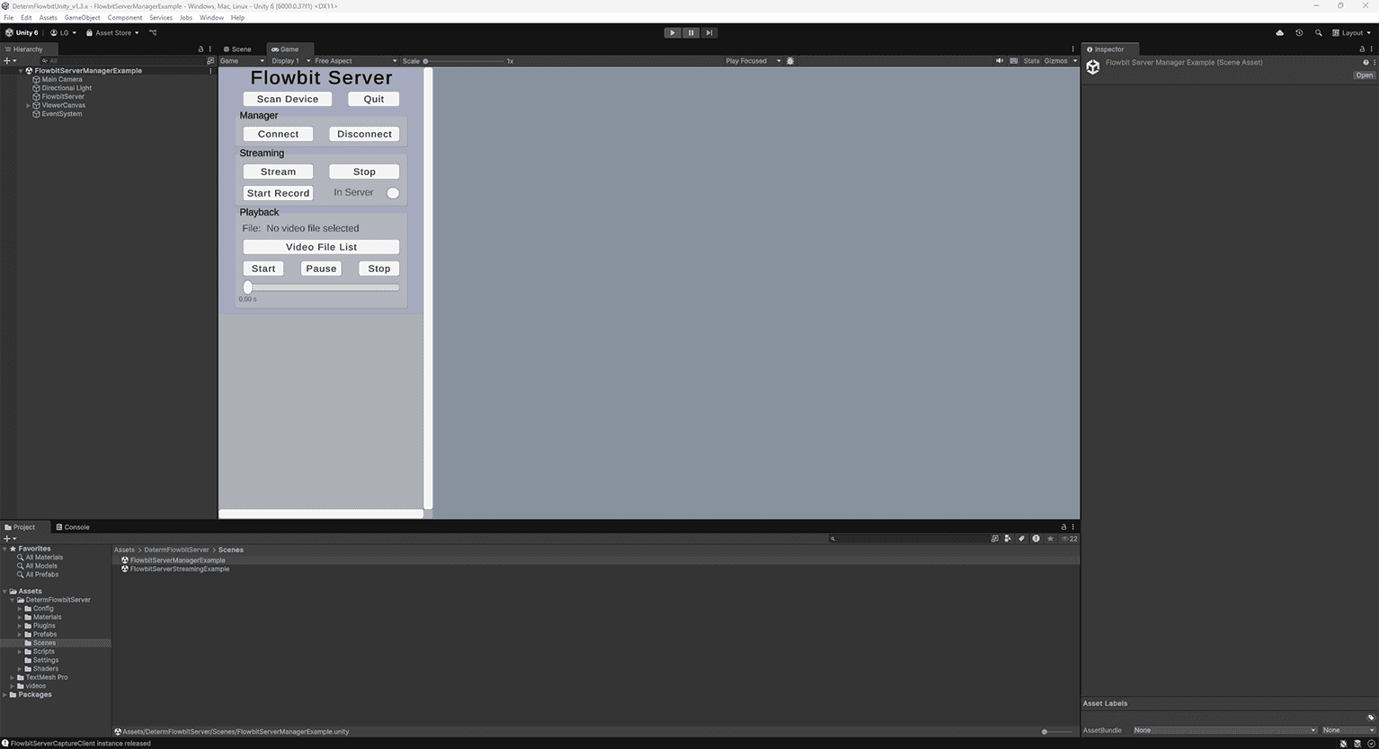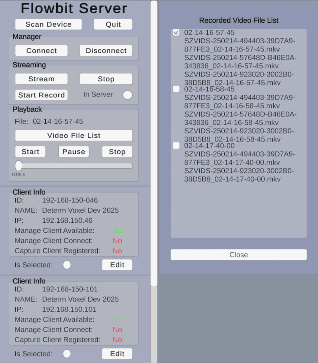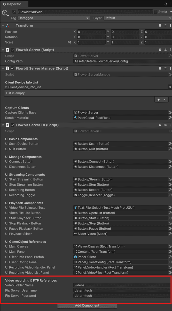 Video recording & FTP Referencefor Flowbit Server UI script in the Inspector of Gameobject of FlowbitServer. As you can see, we set the video folder name asvideos. If the video is recorded on the client device, you need FTP functions to download the videos from the clients to the server. The default FTP serverusername/passwordisdetermtech/determtech.