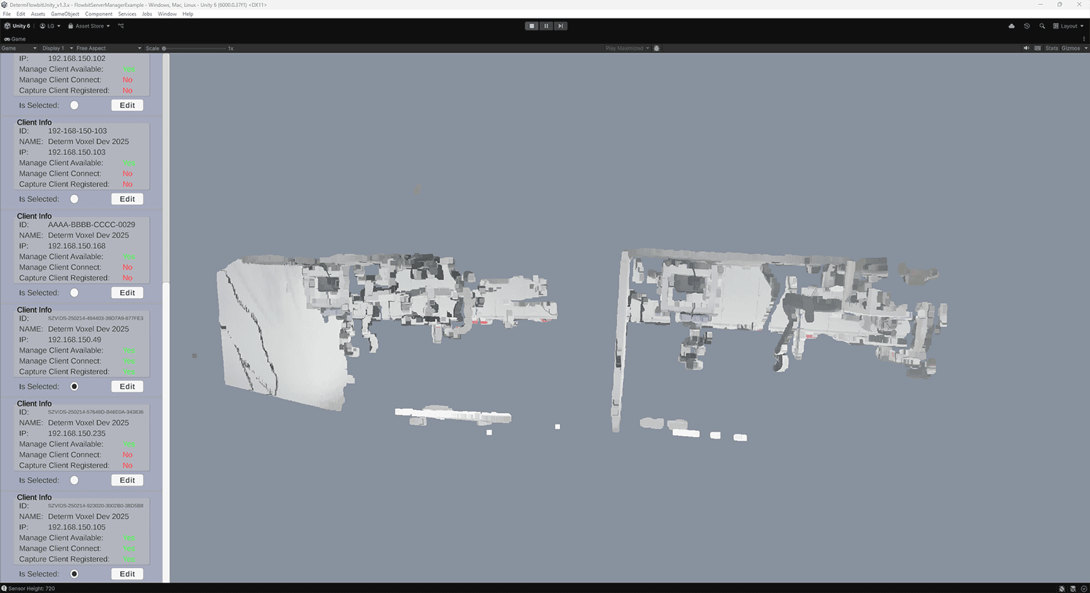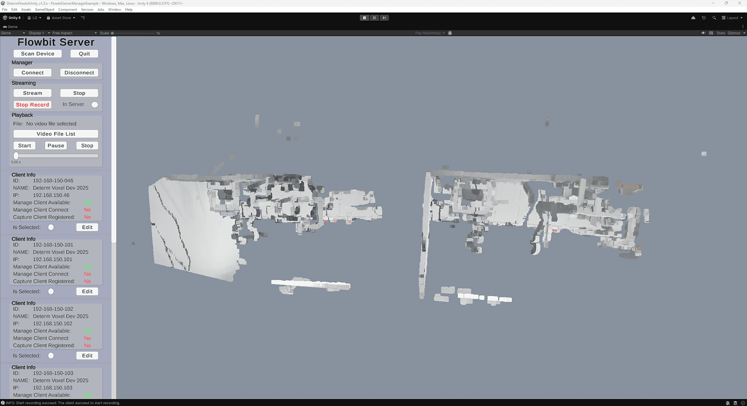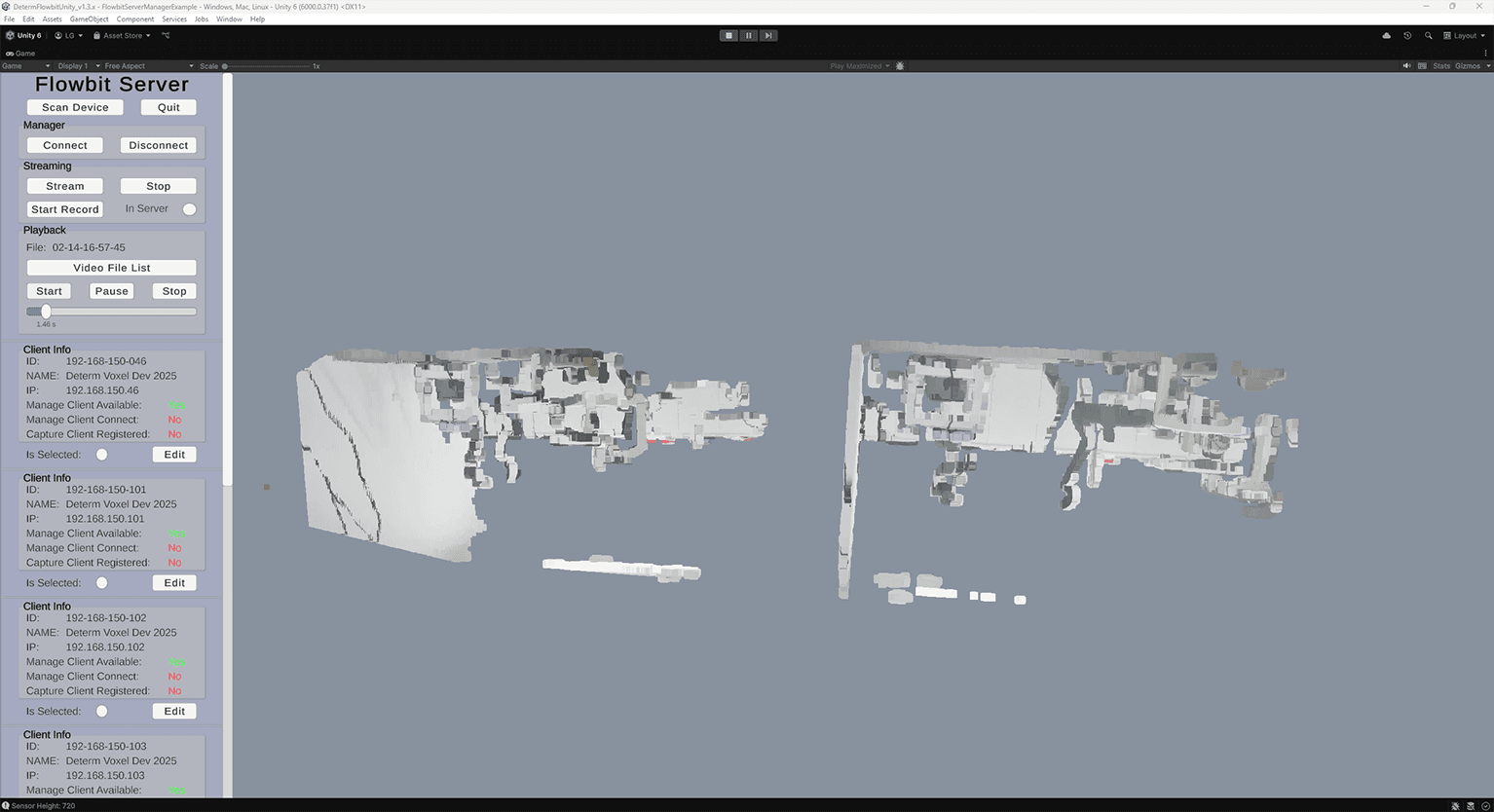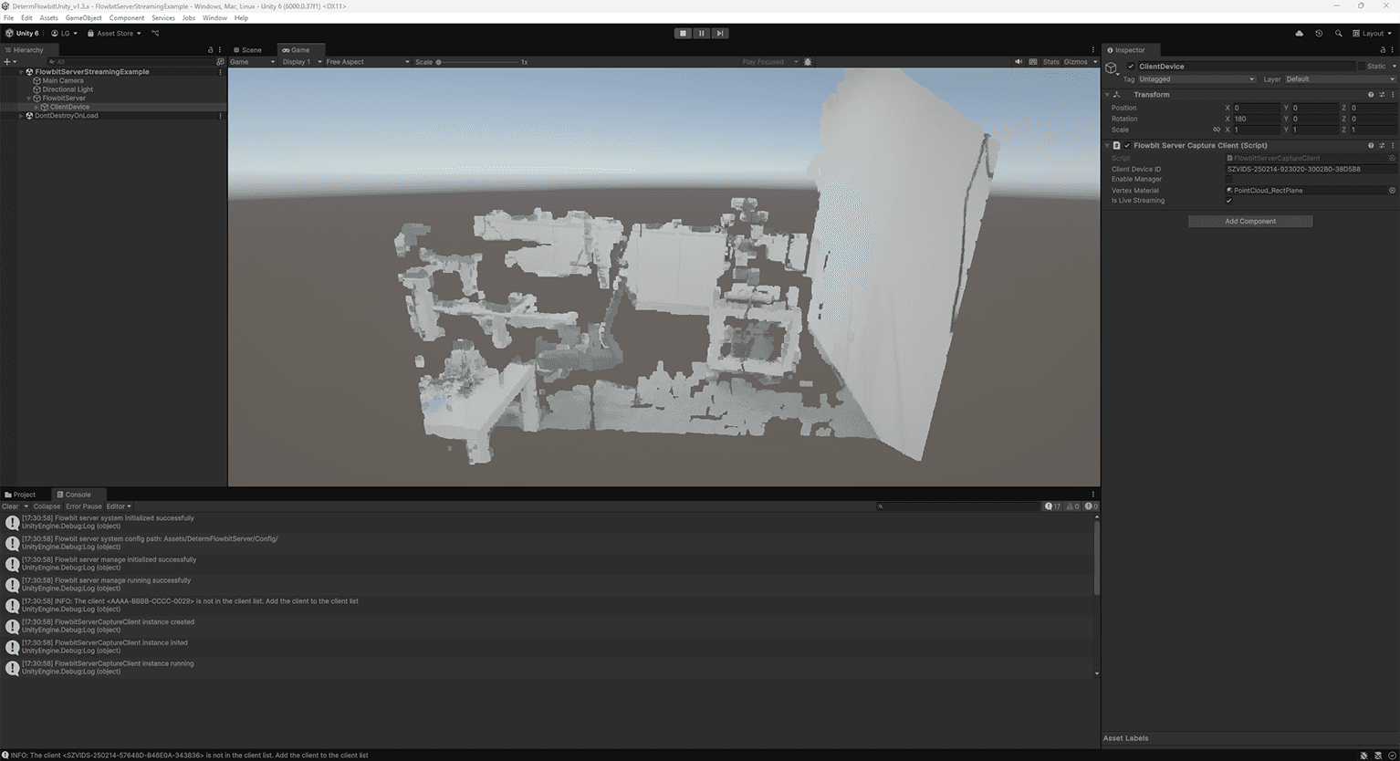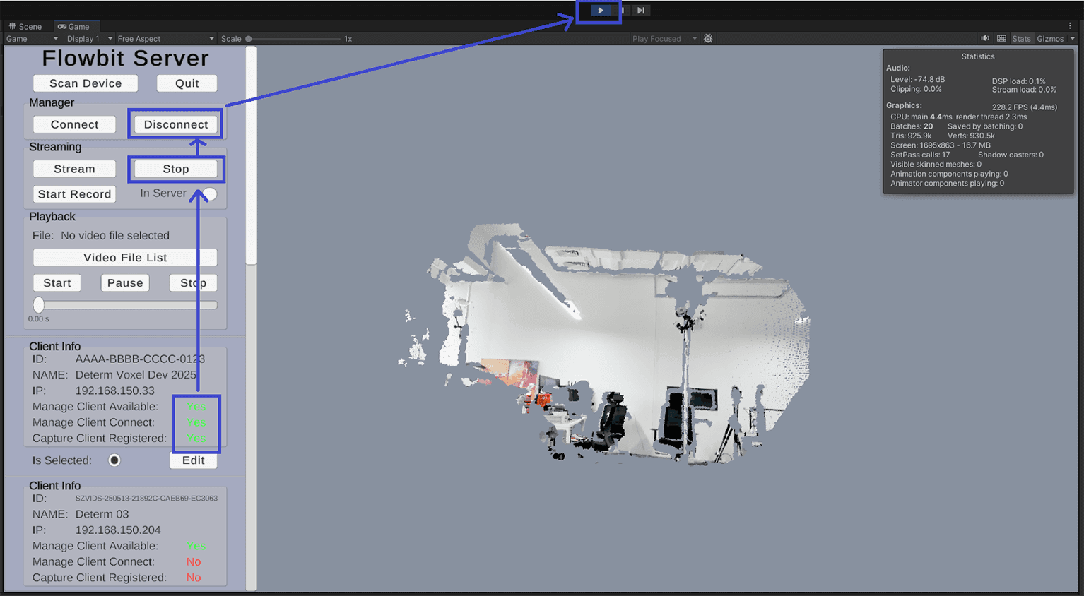 Make sure the client device is working. Then press Play to watch the point cloud in the editor.