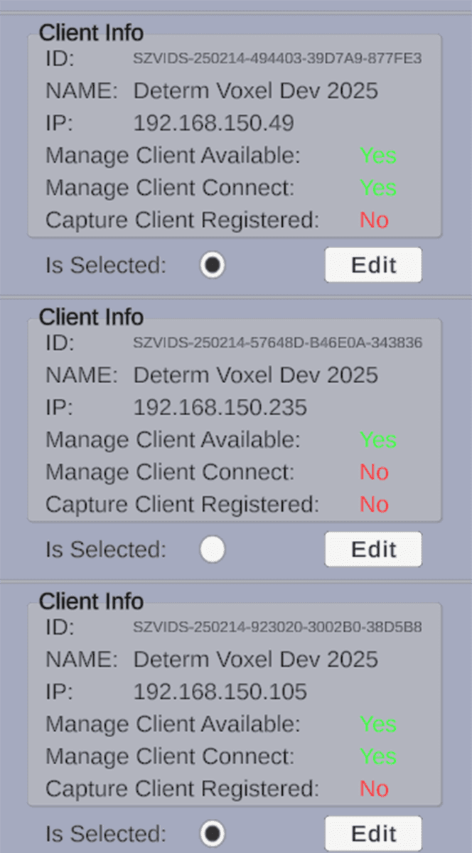 Since there may be more than one client device in the local network, each device detected (after pressing the Scan Device button) will be listed as a Client Info panel. If the Is Selected toggle is on for the Client, the above actions will affect this client, including connection, streaming, and recording.