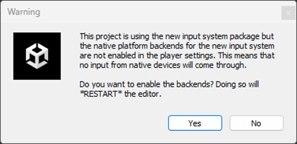 After the Input System is installed, a window will appear. Press “YES” to restart Unity.