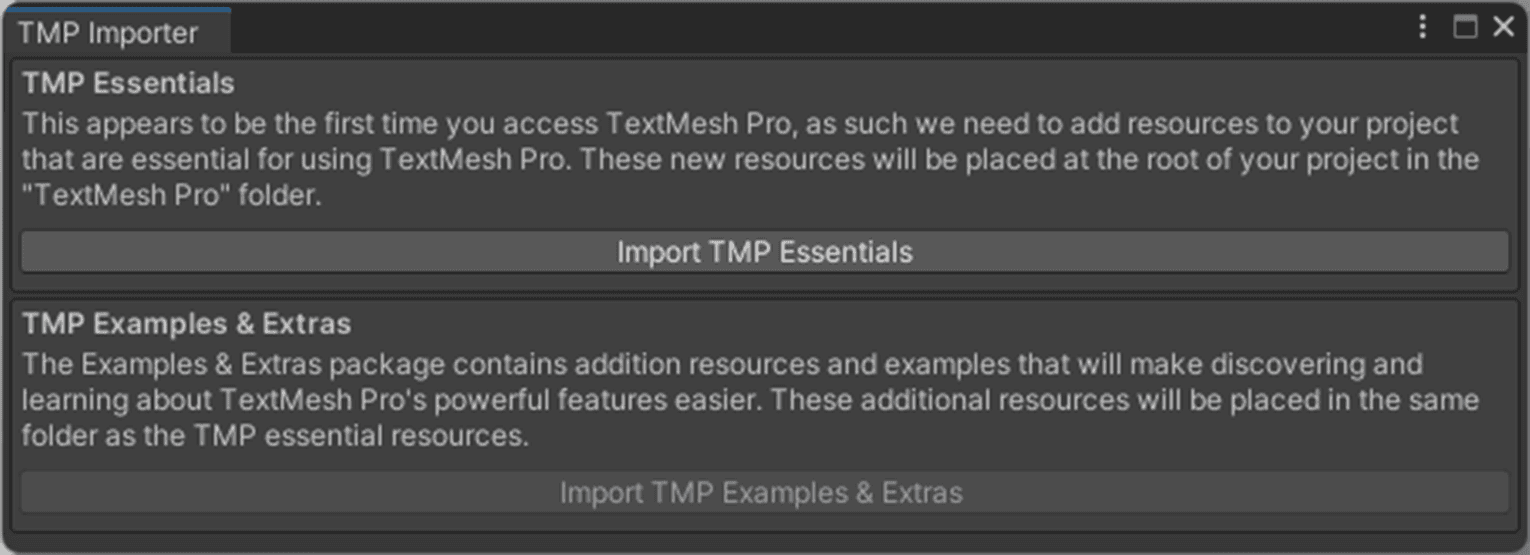For Unity 6000.0.37f1, the TMP importer window will appear. Press “Import TMP Essentials”.