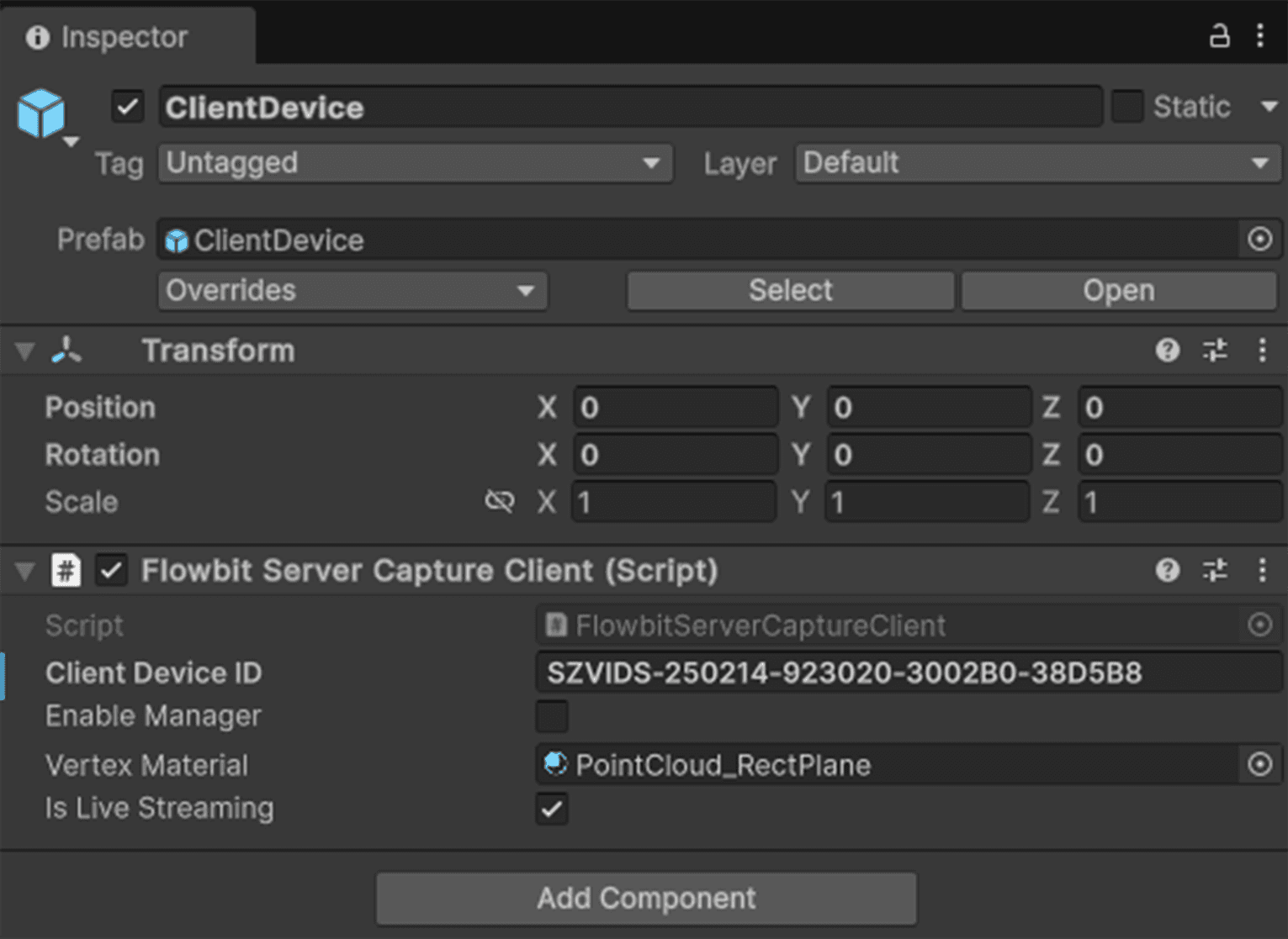 Client Device ID. Here we useSZVIDS-250214-923020-3002B0-38D5B8(It should be theDevice IDof the target client). KeepEnable Managerunticked. KeepIs Live Streamingticked. There are two choices ofVertex Material. You can find both of them in theMaterials/PointCloudfolder. The PointCloud_Vertex material renders the points in the point cloud as single points. The PointCloud_RectPlane renders each point in the point cloud as a small rectangle.